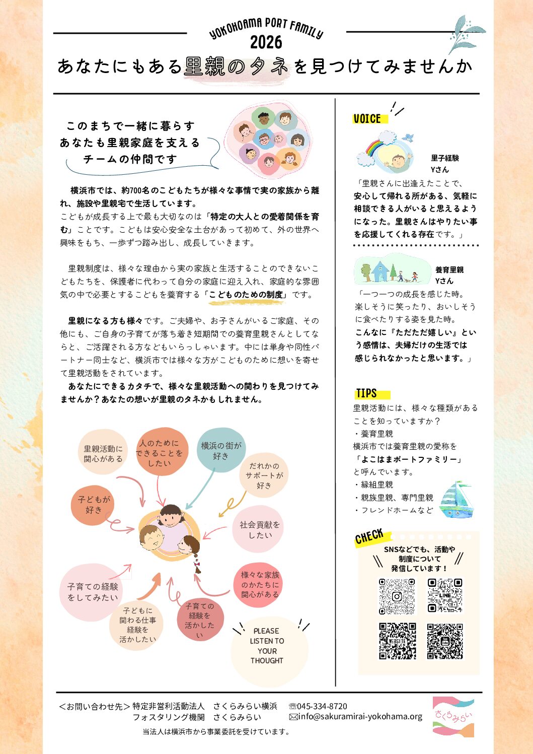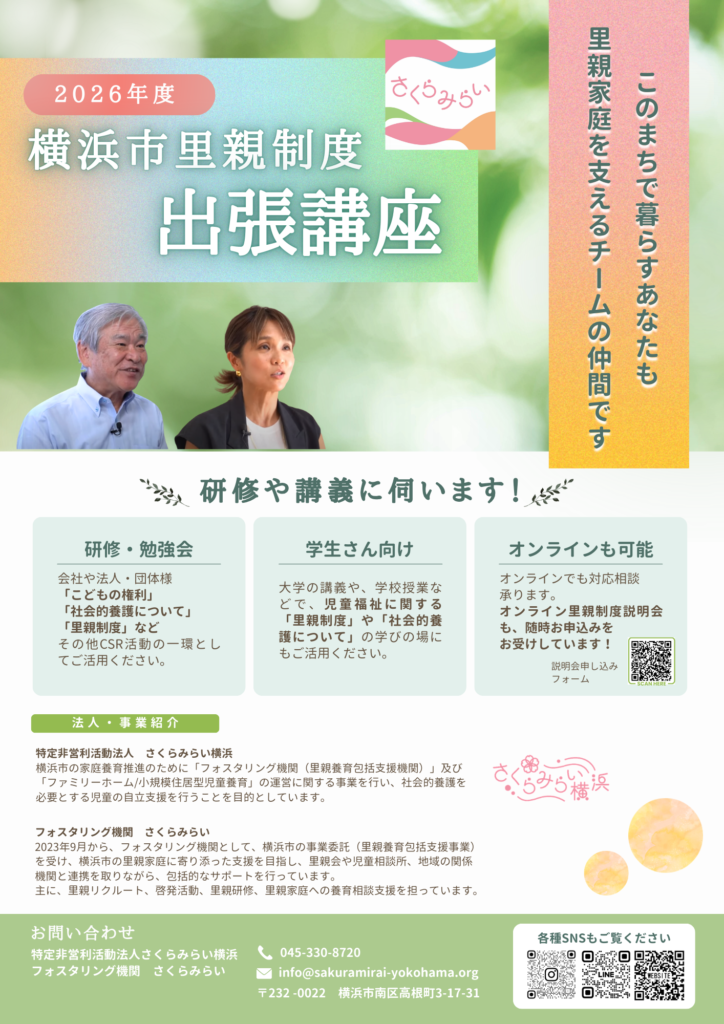 さくらみらいでは、様々な形で里親制度を知る機会を設けています。 「子どものために、何かできることをしたい方」、「様々な家族のかたちに関心がある方」、「里親制度が気になる方」etc… あなたのその想いが『里親のタネ』となり、こどもたちの未来につながる一歩かもしれません🌱 あなたにできるカタチで様々な里親活動への関わりを見つけてみませんか?